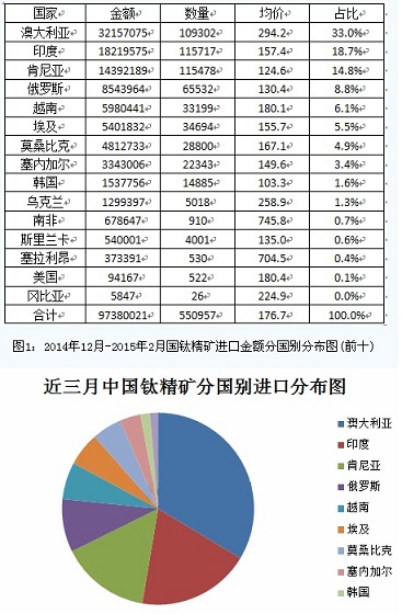 表1:2014年12月-2015年2月中國鈦礦進(jìn)口量價(jià)表(分國別合計(jì))